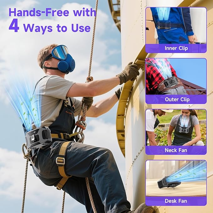 - 【4-in-1 Multifunctional & Portable Design】More than just a wearable fan, this versatile device transforms into multiple cooling solutions: a waist clip fan for hands-free use, a comfortable neck fan with included lanyard, a stable desk fan with built-in stand, and a reliable power source for your devices.