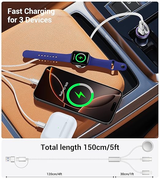 - 【3-in-2 Multi Charging Cable】3-in-2 multi charging cable provide 6 charging modes (USB-C/A for Apple Watch charger, Lightning, and Type-C),which compatible with iWatch Series 1-9, SE, and Ultra models, compatible with iPhone 17/16/15 and newer models,and iPads (Lightning/USB-C).A portable travel charger and a universal charging cable for multiple devices,designed to charge multiple devices at once