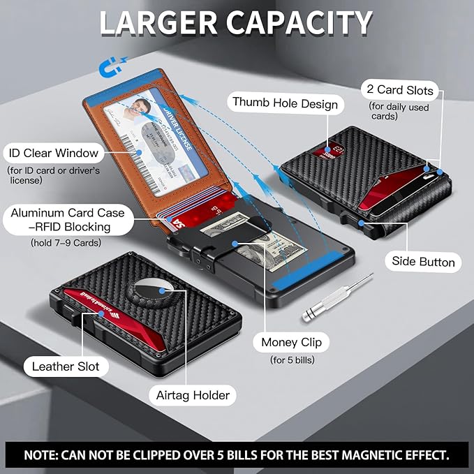 - MINIMALIST BUT LARGE CAPACITY - Our minimalist wallet for men with air tag holder fits effortlessly in pockets without bulk, yet holds 12+ cards, cash and AirTag securely. A money clip on the inside of the card holder helps you store cash(For the best magnetic effect, please DO NOT clip over 5 bills to the money click inside).