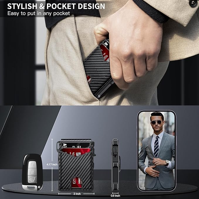 - POP-UP ERGONOMIC DESIGN - One-click pop-up button fans out cards instantly for quick access, ensures that your essentials are easily accessible without the bulk. KIKVES men's money clip wallet is perfect for busy professionals, gym-goers, or travelers needing efficiency, combines fashion and functionality.