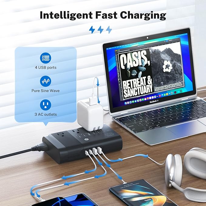 - ✅ Fast Multi-Device Charging: Charge 7 devices at once with 3 US sockets, 2x20W USB-C (PD), and 2x18W USB-A (QC) ports, supporting fast charging for phones, tablets, and laptops. Ideal for families or professionals, it efficiently powers everything from gadgets to espresso machines or mini hair dryers (under 500W), with the total power limit preventing overloads and keeping charging safe and steady.