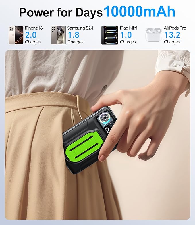 - 【10000mAh High-Capacity Battery】 Provides multiple phone charges for worry-free use on the go. Charges for iPhone 12/13/14 15 16 Pro twice and for iPhone 12/13/14 15 16 Pro Max about 1.5 times. LED Digital Display: Keeps your devices powered all day.Features a clear LED display showing battery level.It's also an essential for travel and camping. Never worry about low battery again.