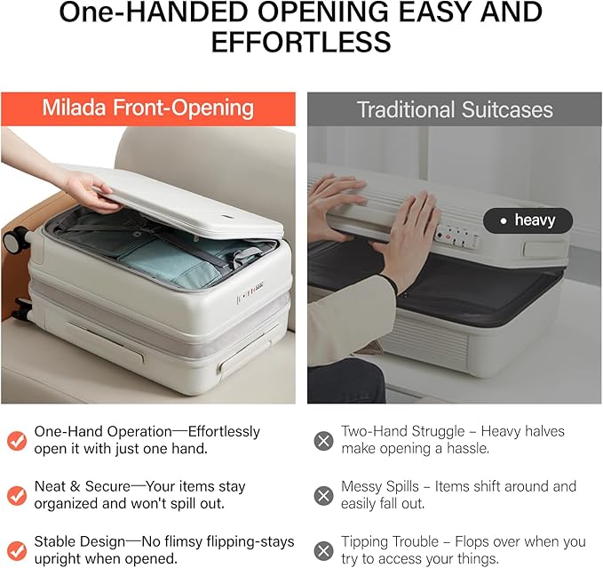- ONE-HANDED OPENING:Front opening design, the new opening and closing method to open or close the suitcase effortless to liberates your hand. Reduse the area of 50% saving space, you can open it in any crowded place and making access to your belongings a breeze