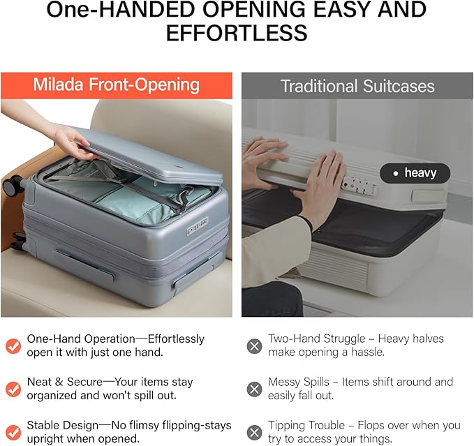 - ONE-HANDED OPENING:Front opening design, the new opening and closing method to open or close the suitcase effortless to liberates your hand. Reduse the area of 50% saving space, you can open it in any crowded place and making access to your belongings a breeze
