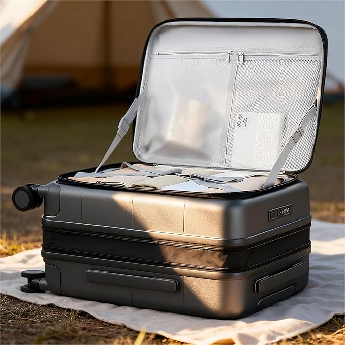 - Smart Expansion for 15% Extra Capacity: Unlock up to 6L additional packing space instantly. Our expandable design transforms this hard shell carry on luggage into a versatile traveler, letting you pack souvenirs or extra essentials effortlessly