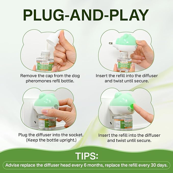 - GENTLE STRESS RELIEF FOR DOGS: Puyrzoe dog calming diffuser releases a gentle, pheromone-inspired formula that helps ease common stress-related behaviors in dogs, such as excessive barking, biting, destructive chewing, urine marking, and tension. Whether it’s loud noises, thunderstorms, new environments, or vet visits, this dog anxiety relief diffuser helps your dog feel more at ease and improves household harmony.