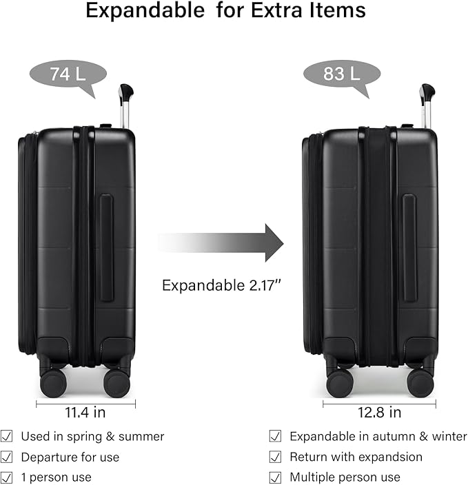 - Smart Expansion for 12% Extra Capacity: Unlock up to 9L additional packing space instantly. Our expandable design transforms this Hard Shell suitcase into a versatile traveler, letting you pack souvenirs or extra essentials effortlessly