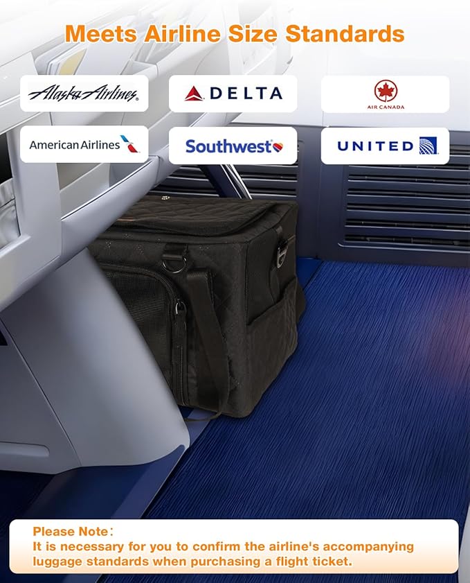 - TSA APPROVED PET CARRIER IN CABIN: Fly worry-free knowing the PETUX airline approved pet carrier meets cabin size standards for Alaska (17" × 11" × 9.5"), Southwest, Delta, United, American, and Air Canada airlines. Measuring 16" × 10" × 9.5", it easily slides under airplane seats so your cat can stay close and comfortable throughout the journey. Perfect for small cats up to 10 lbs
