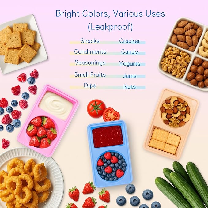- 3-Pack Reuseable Food Containers with Lids, Mini Double Compartment for Mess-Free Snacking: Each SEVENKA silicone food container measures about 5.7 x 3.5 x 1.3 inches (L x W x H) and features two compartments (one round, one rectangular) to separate small fruits, dips, nuts, sauces, jams, salad dressings, yogurts, candy, cracker … great for portion control and flavor separation