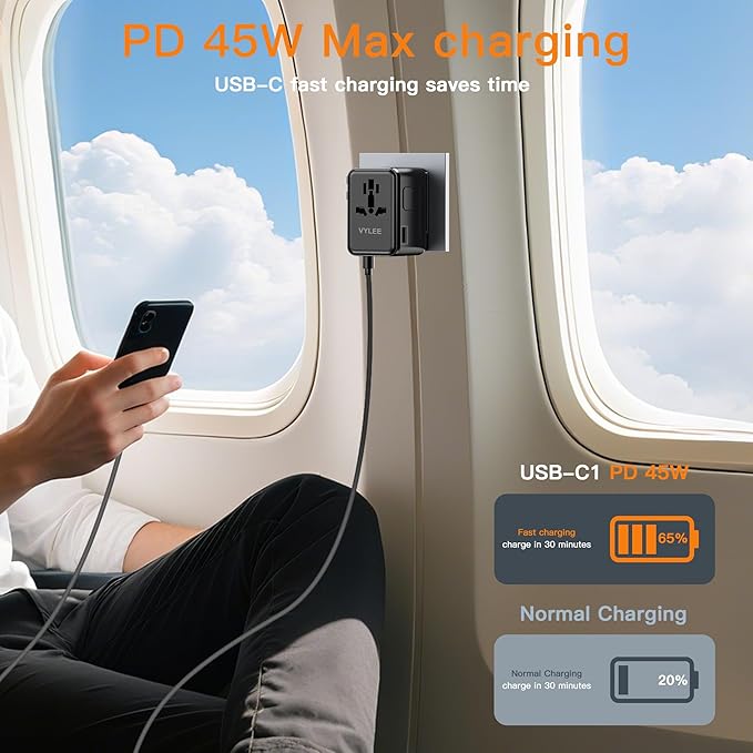 - FAST CHARGING: This international adapter is equipped with 3 USB-C ports, 1 USB-A ports and 1 AC outlet (Max 1100W at 110V & 2500W at 250V) and supports PD3.0 & QC3.0 fast charging. One of the USB-C PD ports can even reach an incredible high speed of 45W. Ideal for iPhone 16 or other iPhone model, Samsung and other Android phones, smart watch, tablet, power bank, camera, handheld game console, headsets, and everything else that is charged through a USB port