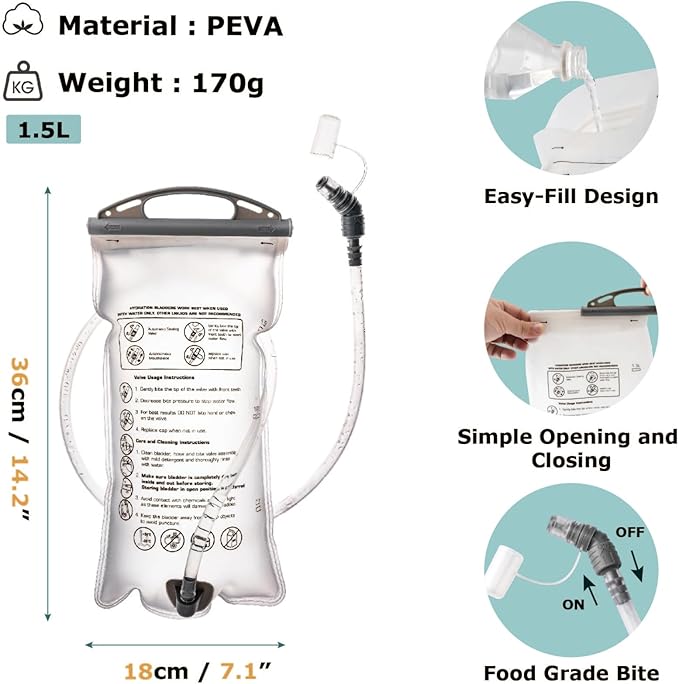 - Lightweight hydration backpack: Easily carries essentials with a main compartment for a 1.5 L or 2 L hydration bladder (sold separately or included), choose between the backpack only or bundled with a 1.5 L or 2 L water bladder, please select the options carefully