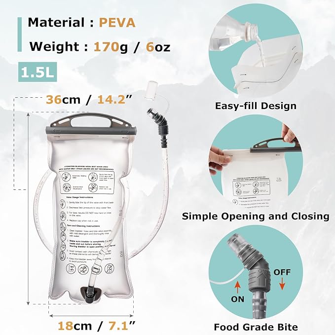 - Lightweight hydration backpack: Easily carries essentials with a main compartment for a 1.5 L or 2 L hydration bladder (sold separately or included), choose between the backpack only or bundled with a 1.5 L or 2 L water bladder, please select the options carefully