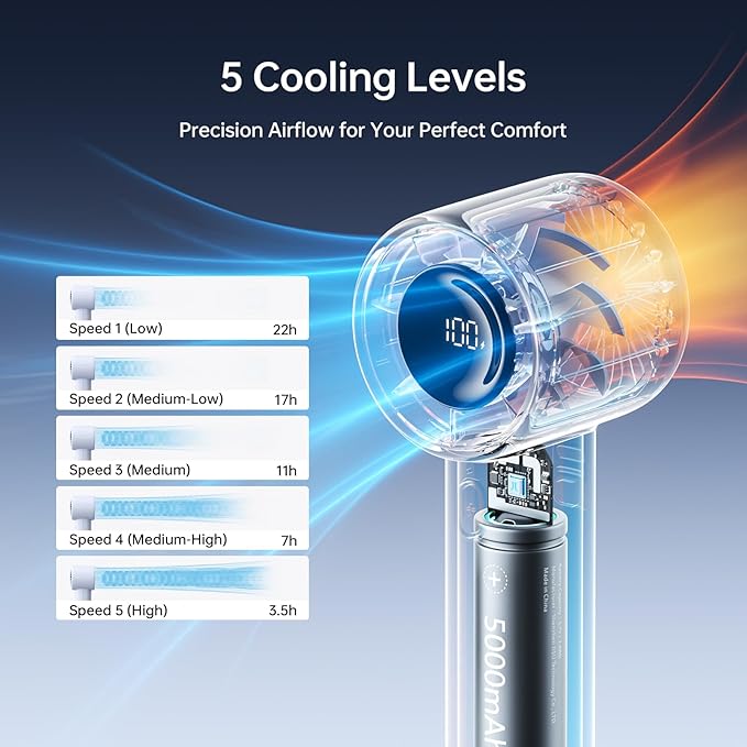 - 5 Cooling Wind Speeds:Take control of your comfort with 5 precise speed settings—from a soft whisper-quiet breeze to an instant high-powered cooling blast. This personal fan lets you personalize airflow whether you're working, commuting, or exploring outdoors