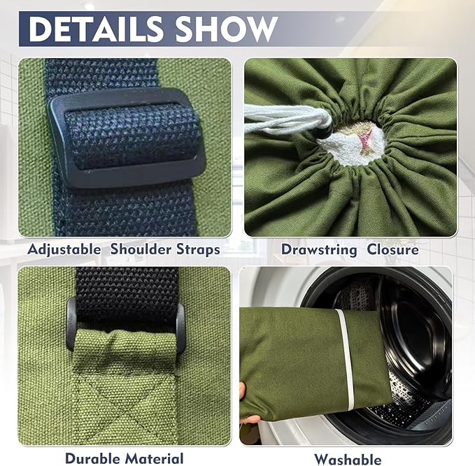Canvas Laundry bag, Washable Laundry backpack, Adjustable Straps, Large Front Pocket, Drawstring Closure (ARMY GREEN, XX-Large)