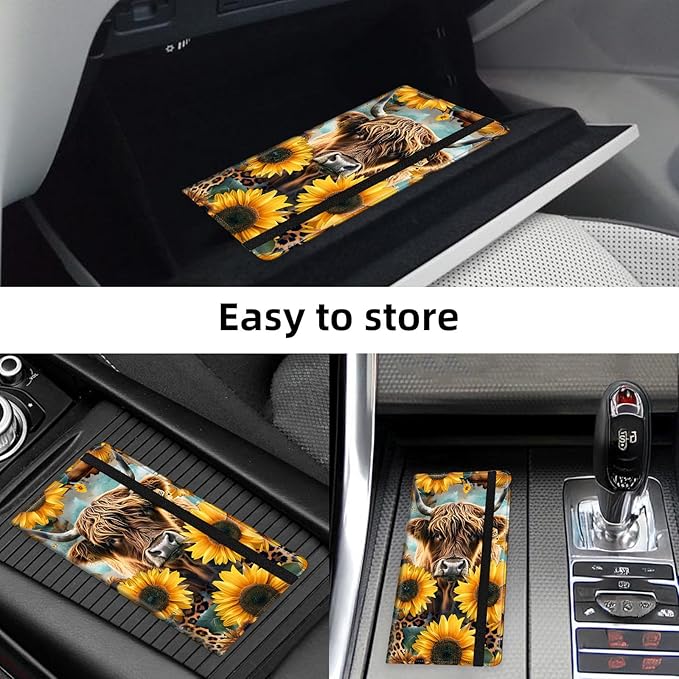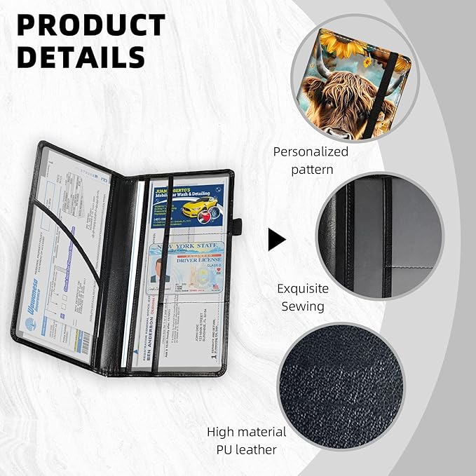 Car Registration and Insurance Holder PU Leather Vehicle Insurance and Registration Holders Wallet Case with Elastic Band Closure for ID Card, Driving Licence, Sunflower Highland Cow