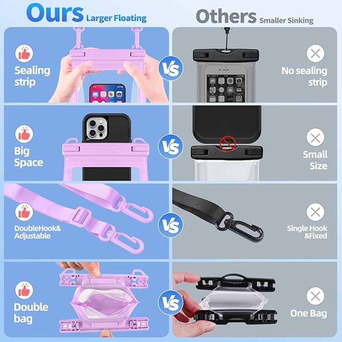 - SECURE DOUBLE HOOKS & ADJUSTABLE LANYARD: Our waterproof phone pouch is equipped with double hooks for added strength and security. The adjustable lanyard with versatile straps allows you to wear the pouch around your neck, or as a crossbody or shoulder bag for hands-free convenience. Make the most of your water activities while keeping your phone safe. But always test the waterproof pouch before use by soaking tissue inside for 10 minutes
