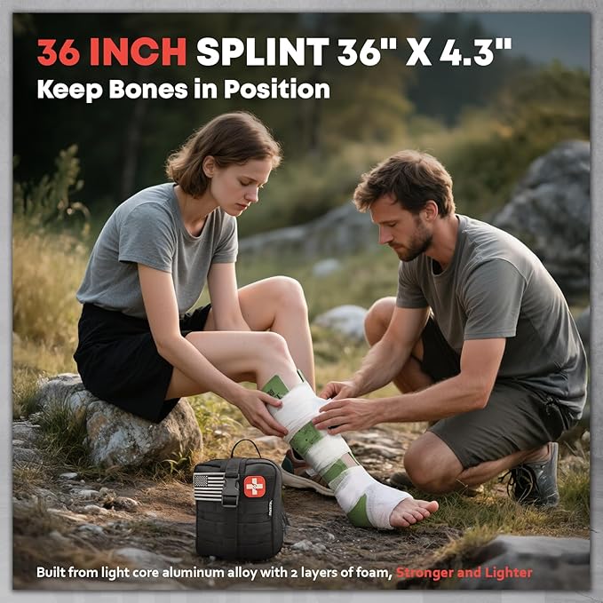 - Professional Trauma First Aid Kit - Equipped with military tourniquet, compression bandage, Emergency Trauma Bandage and 36” splint for severe bleeding, fractures, and emergencies. IFAK compliant,. Our Emergency Kit are ideal for camping, hiking, out-of-home emergencies, combat lifeguards, first responders, outdoor enthusiasts and more!