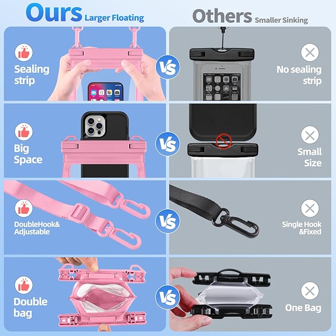 - SECURE DOUBLE HOOKS & ADJUSTABLE LANYARD: Our waterproof phone pouch is equipped with double hooks for added strength and security. The adjustable lanyard with versatile straps allows you to wear the pouch around your neck, or as a crossbody or shoulder bag for hands-free convenience. Make the most of your water activities while keeping your phone safe. But always test the waterproof pouch before use by soaking tissue inside for 10 minutes