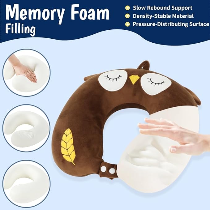 Sexysamba Travel Pillow for Kids Adults with Sleep Eye Mask Cute Cartoon U Shaped Memory Foam Neck Pillows for Travel Head Rest & Neck Support for Airplane, Car, Office Sleeping, Brown Owl