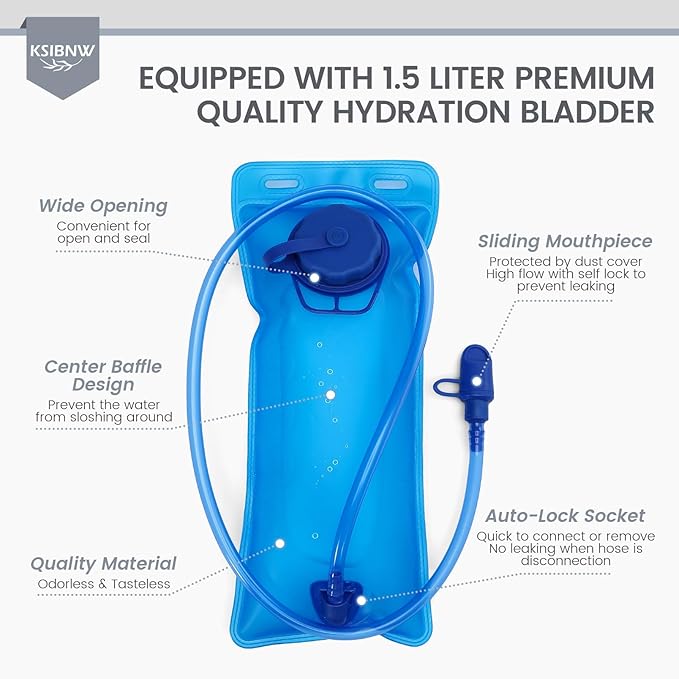 - 【1.5L Water Bladder】Running Vest contains a 1.5L water bag. The water pipe is strong and durable and resistant to bending. It adopts an anti-spill straw nozzle with a self-locking device to prevent leakage, and the dust cover is hygienic to use.
