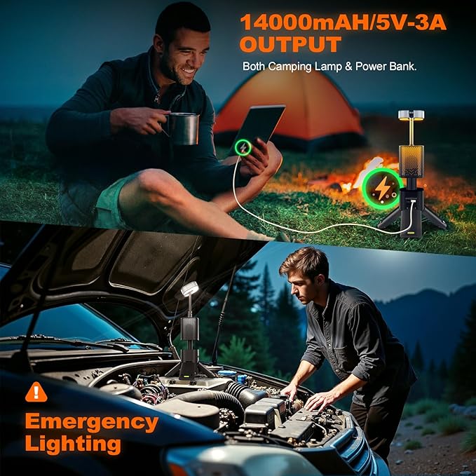 - Long Life: This camping light has a built-in, rechargeable, high-capacity 14,000 mAh battery that will keep you lit for six to 50 hours, depending on the brightness setting. In an emergency, you can also use it to recharge your cell phone, tablet, and other devices