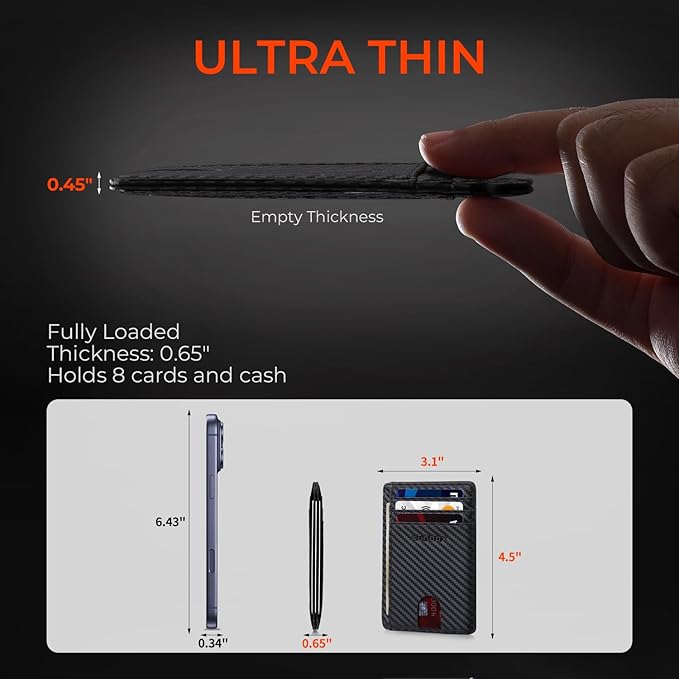 - STYLISHLY SMALL, SLIM and DISCREET: Measuring just 4.5"x 3.1"x0.45", our RFID front pocket slim wallet is super thin and modernly slim. It's the minimalist wallet that fits perfectly in your pocket, purse or travel pack