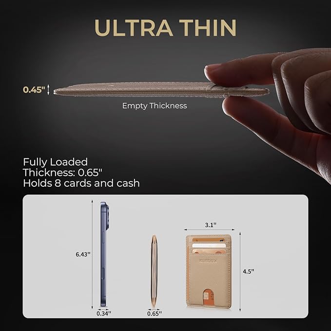 - STYLISHLY SMALL, SLIM and DISCREET: Measuring just 4.5"x 3.1"x0.45", our RFID front pocket slim wallet is super thin and modernly slim. It's the minimalist wallet that fits perfectly in your pocket, purse or travel pack