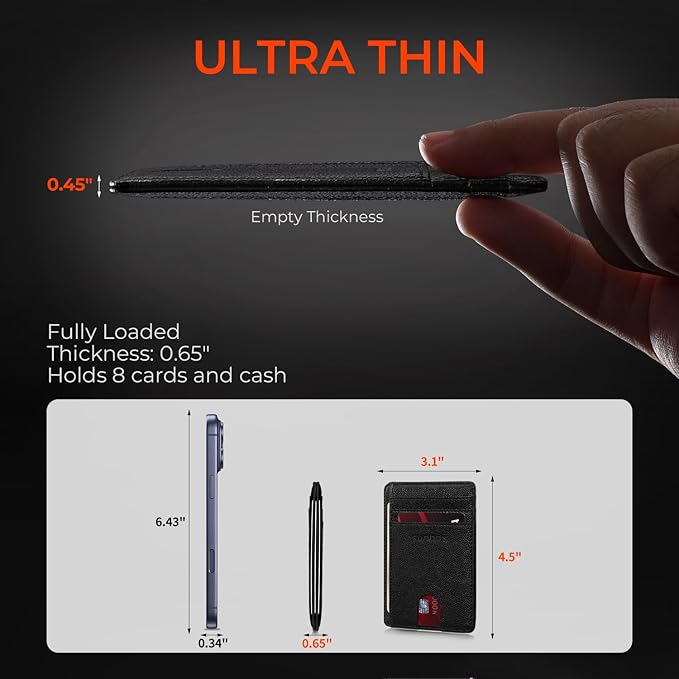 - STYLISHLY SMALL, SLIM and DISCREET: Measuring just 4.5"x 3.1"x0.45", our RFID front pocket slim wallet is super thin and modernly slim. It's the minimalist wallet that fits perfectly in your pocket, purse or travel pack