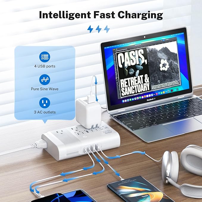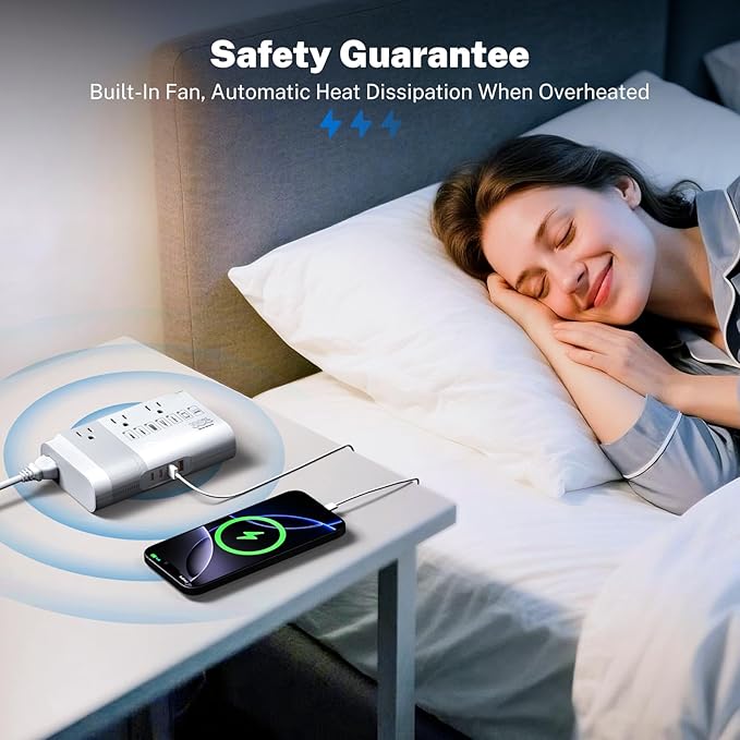 - ✅Fast Multi-Device Charging: Charge 7 devices at once with 3 US sockets, 2x20W USB-C (PD), and 2x18W USB-A (QC). . Ideal for families or professionals with multiple gadgets, it handles phones, tablets, laptops, and small appliances efficiently. Total 500W power limit prevents overloads, keeping charging safe and steady.
