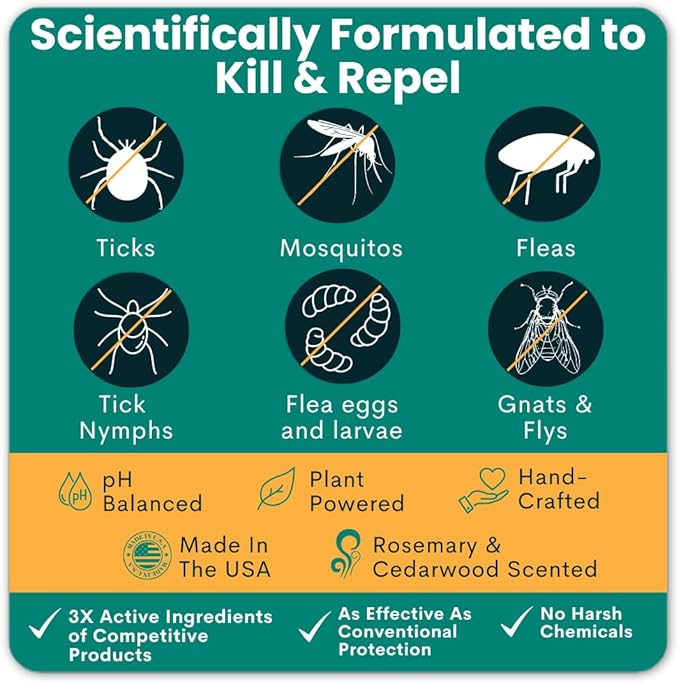 - ✅ KILLS AND REPELS FLEAS, TICKS & MOSQUITOS: Infused with essential oils, our Extra Stregth formula provides effective, natural defense against pests for you and your pet. Our formula is effective in killing 98-100% of fleas, ticks, and other pests by contact, while providing an invisible shield that repells & prevents new pests.