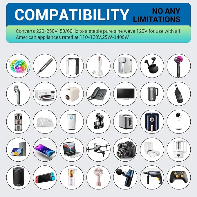 - voltage converter us to europe: Can be used for 25W-1400W (110V-120V) power equipment in European 110V-250V countries. (Please do not use high power appliances over 1400W).
