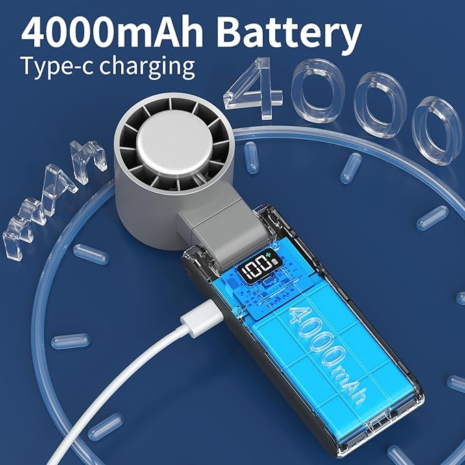 - Long-Lasting Rechargeable Battery: Powered by a 4000mAh rechargeable battery, this turbo fan runs up to 2 hours at max speed. The high-efficiency motor delivers powerful airflow at up to 10,000 RPM in a compact design.