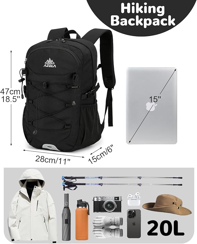 - Small Hiking Backpack: Measuring 47*28*15cm/18.5"*11"*6", this 20l backpack is equipped with dual side compression straps for helping tighten your load. The trekking pole attachments keep your hands free.