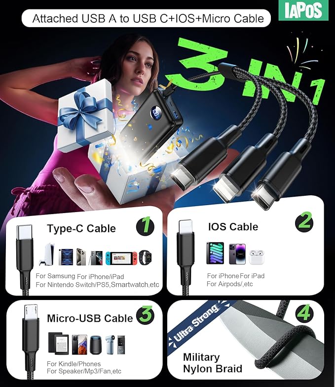 - [Charge 5 Devices at Once]: Includes a 3-in-1 cable (USB-C, Lightning, Micro USB)—industrial-grade nylon-braided for tough durability and fray resistance. This versatile 3-in-1 cable is the key to the IAPOS battery pack charging 5 devices simultaneously: phone, tablet, game console, headphones, even a fan. Essential for camping, travel, festivals, and multi-gadget homes!