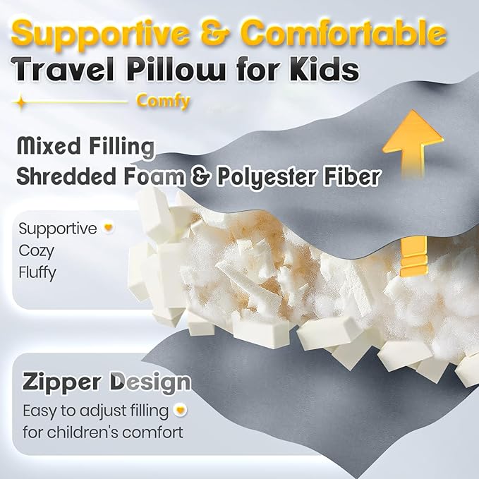 - Ultimate Comfort for Kids: Our kids travel pillow are filled with mixed high-end shredded memory foam and polyester fiber, fluffy and comfortable, being more supportive while not easy to deform, providing excellent support for children to sleep and rest with