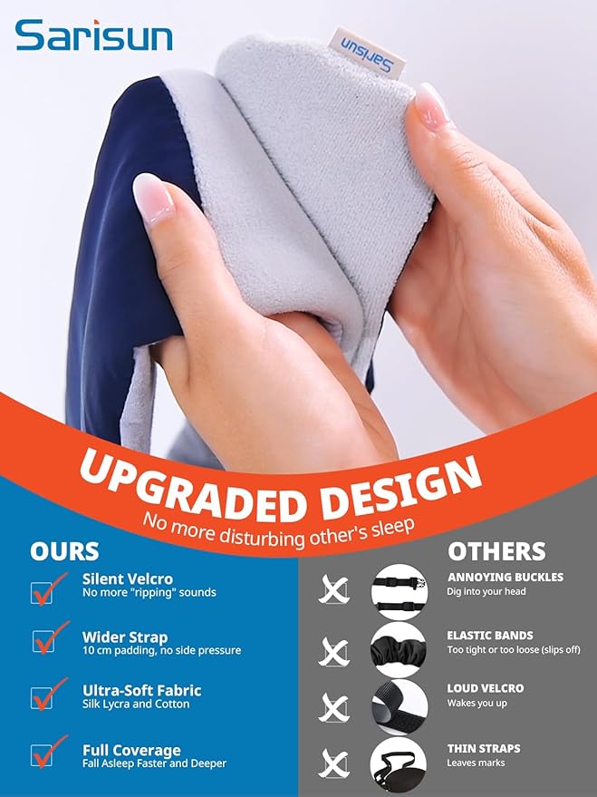 - SARISUN Patented Sleep Mask – Engineered for Deeper, More Restful Sleep: Its wraparound ergonomic design effectively blocks out light from all directions. No eye pressure, no gaps, just pure darkness to help you fall asleep faster and stay asleep longer.