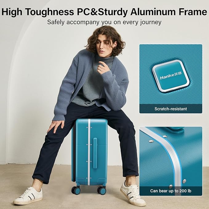 Hanke 24 Inch Luggage with Cup Holder and Charge,Top Opening Hard Shell Suitcases with Wheels and Dividers,Aluminum Frame Trunk Luggage Medium Checked Suitcase with Lock for Travel,Caribbean Blue