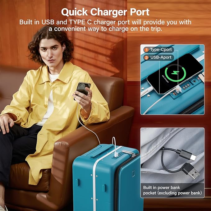 - 【Quick Charger Port】This medium luggage with charger built in USB and TYPE C charger port,you only need to connect the power bank to the cable in the pocket inside and the travel suitcase will provide you with a more convenient way to charge your electronic devices on the trip.