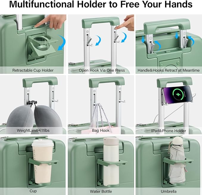 - 【Multifuctional Holder】This suitcase with cup holder is convenient to place drinks, water bottle, etc. And amazingly the hard case luggage has a phone/IPAD holder on the handle and it also be as a hook while traveling to hang your bag, U-shaped pillow.