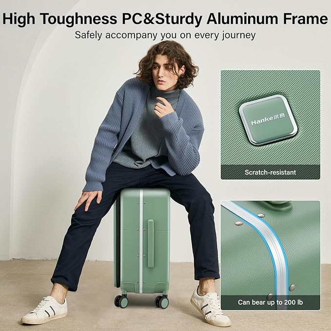 Hanke 24 Inch Luggage with Cup Holder and Charge,Top Opening Hard Shell Suitcases with Wheels and Dividers,Aluminum Frame Trunk Luggage Medium Checked Suitcase with Lock for Travel,Forest Green