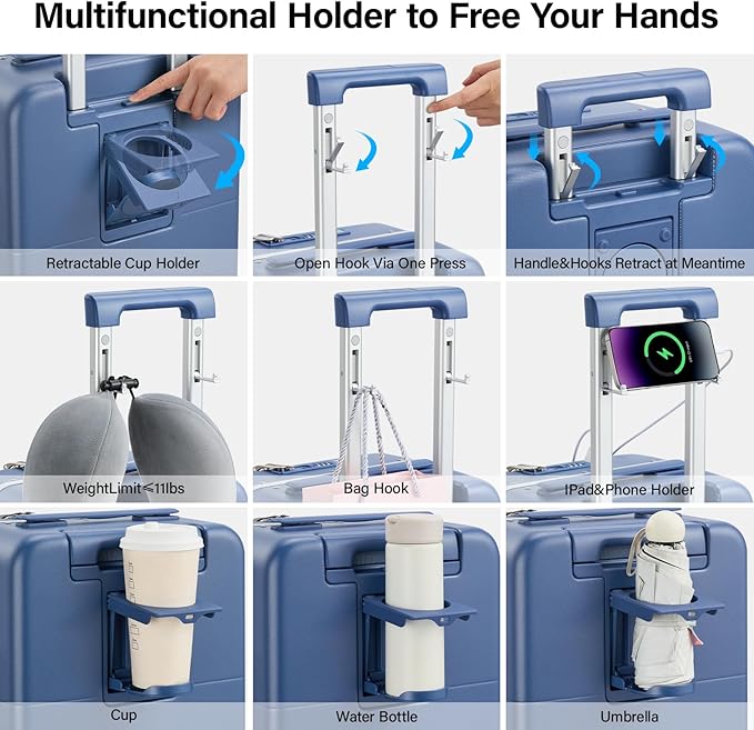 - 【Multifuctional Holder】This suitcase with cup holder is convenient to place drinks, water bottle, etc. And amazingly the hard case luggage has a phone/IPAD holder on the handle and it also be as a hook while traveling to hang your bag, U-shaped pillow.