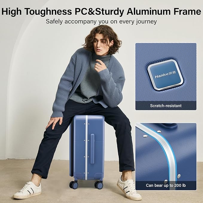 Hanke 24 Inch Luggage with Cup Holder and Charge,Top Opening Hard Shell Suitcases with Wheels and Dividers,Aluminum Frame Trunk Luggage Medium Checked Suitcase with Lock for Travel,Interstellar Blue