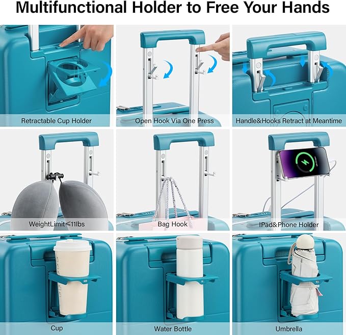 - 【Multifuctional Holder】This carry on with cup holder is convenient to place drinks, water bottle, etc. And amazingly the hard case luggage has a phone/IPAD holder on the handle and it also be as a hook while traveling to hang your bag, U-shaped pillow.