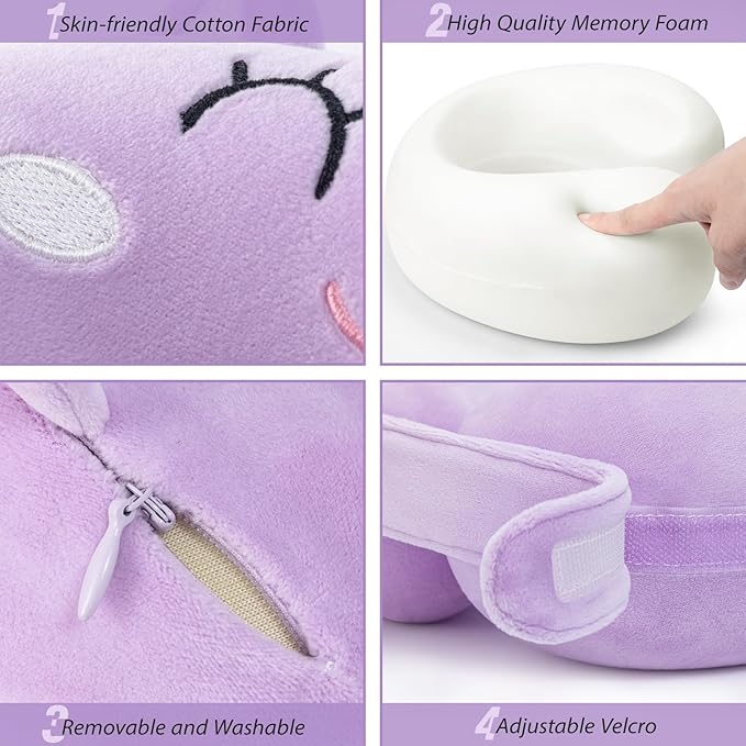 Car Pillow for Big Kids Travel Neck Pillows, Foam Neck Support Travelling Pillow with Washable Cotton Pillowcases and Storage Bag, for Airplane, Train, Flight and Home Use Unicorn Purple