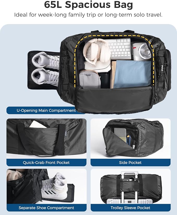 pack all 65L Foldable Travel Duffel Bag, Packable Weekender Bag with Shoe Compartment, Water-Resistant Gym Bag with Adjustable Strap for Overnight, Sports and Camping (Black)