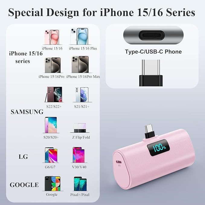 - 【Mini Portable Charger with USB-C Port】 - This small power bank with build-in USB C connector, and widely compatible with iPhone 17/17 Air/17 Pro/17 Pro Max/iPhone 16/16 Plus/16 Pro/16 Pro Max/15/15 Plus/15 Pro/15 Pro Max/iPad Air/AirPods/Samsung Galaxy S25/ S24/ S23/ S22/ S21 Plus/Note/Google Pixel7/7 Pro/6/6 Pro/7A/6A/5/4/4A/Huawei, or more Andriod USB C cell phones etc.