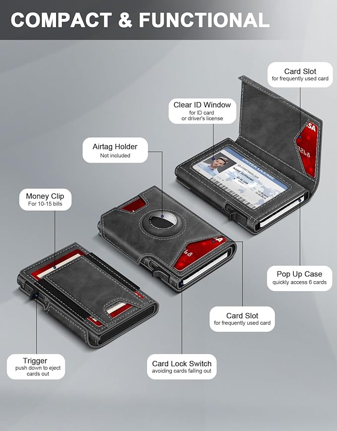 • QUICK CARD ACCESS: This leather wallets combines high-quality leather and premium metal, featuring a smooth pop-up mechanism. Simply press the side button on the metal wallet for men, all cards pop up at a step pattern that makes them very easy & convenient to take out.
