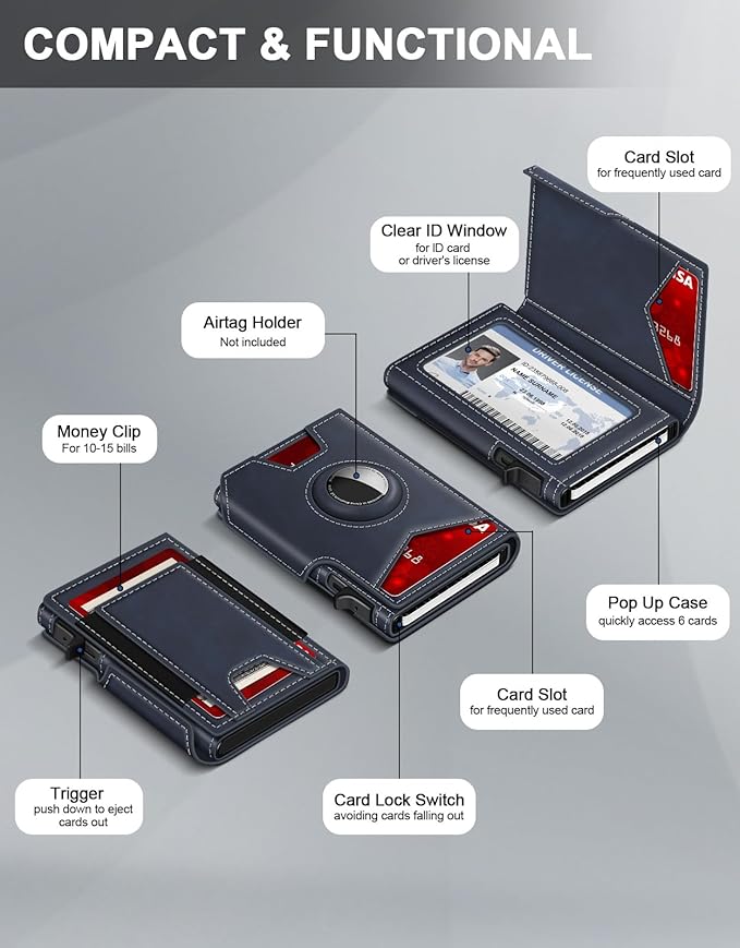 - QUICK CARD ACCESS: This leather wallets combines high-quality leather and premium metal, featuring a smooth pop-up mechanism. Simply press the side button on the metal wallet for men, all cards pop up at a step pattern that makes them very easy & convenient to take out.