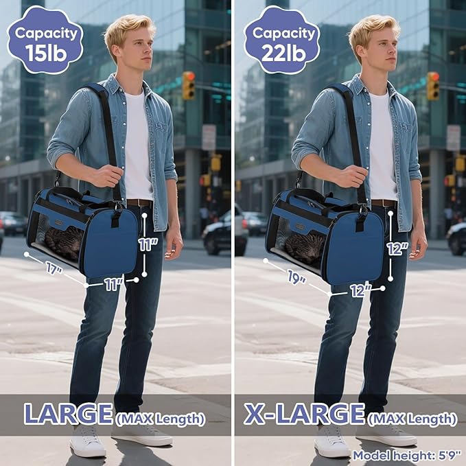 - Check Size First: The pet carrier is collapsible and available in two sizes: L (17"x11"x11", Airline Approved) for pets up to 15 lbs, and XL (19"x12"x12", NOT Airline Approved) for pets up to 22 lbs; Note: Check your airline's size regulations before boarding to ensure compliance; For a proper fit, please reference your pet's length and height rather than relying solely on weight