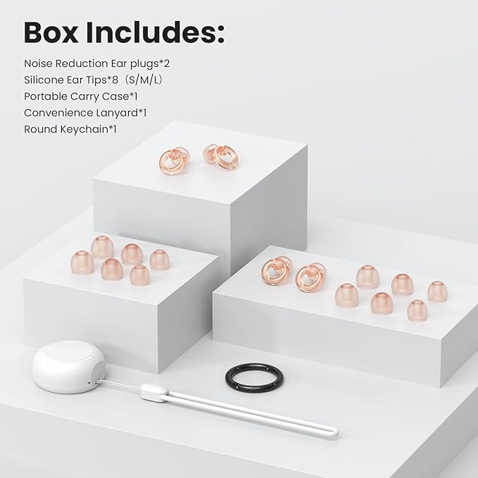 - In the Box: 2 pairs of earplugs; 8 pairs of ear tips (S/M/L);Carry case with silicone rope*1; round carabiner*1; Hope everyone enjoys that piece of serenity in their lives.